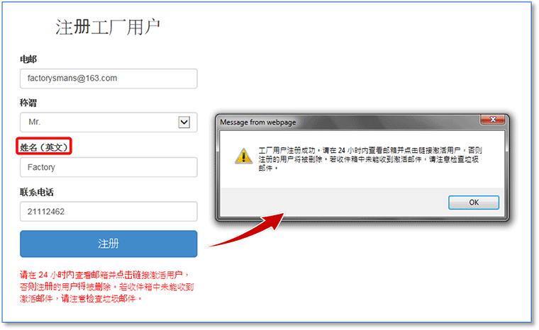 其中带*为必填项,填写后点击 “注册”按钮。弹出提示对话框后,点击“确认”完成新工厂用户注册。注册后需要透过邮箱激活才能进入系统。